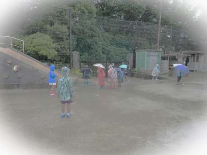 昨日は、京極幼稚園に行き、みずあそびをしました。鶴山保育所さんと京極幼稚園さんと一緒に、あわあそびやいろみずあそび、どろあそびを夢中になって楽しみました。今日はあいにくの雨でプールが中止になりました。その代わりに、雨の日探検をしました。水たまりに入ったり、雫を眺めたり、木の下で雨を感じたりしました。