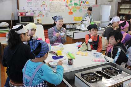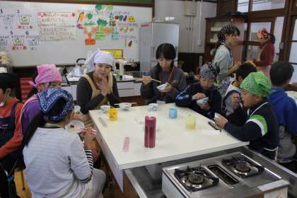 5年生が、同志社女子大学の学生さんといっしょにお米の学習をしました。今日は、先日、脱穀したお米を使ってご飯を炊きました。また、今年の6月に収穫し、漬け込んだ