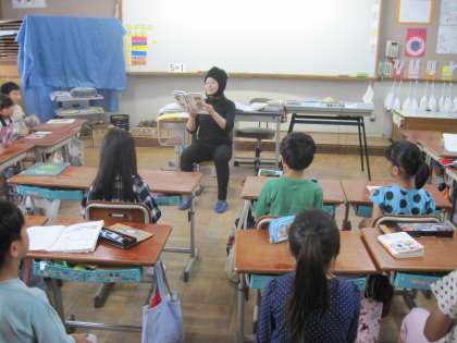 今日の2年生への読み聞かせはいつもと少し違っていました。子どもたちが手足を鳴らしてリズムを取り,そのリズムに合わせて読み聞かせをしていただきました。いつもと違って子どもたちは体を動かしながら楽しく読み聞かせを聞いていました。