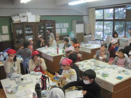 先日精米したお米を使ってご飯を炊きました。お鍋を使って,ガスで炊きました。できあがったご飯はとてもよい香りがして,おいしかったです。今日の学習も同志社女子大学栄養生理研究室の先生と学生さんにお手伝いをしていただきました。