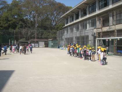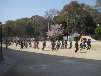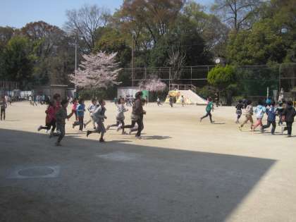 今日から業間体育を始めました。5分間マラソンに子どもたちはがんばって取り組んでいます。1年生は昨日入学したばかりなので,業間体育の様子を見学しました。