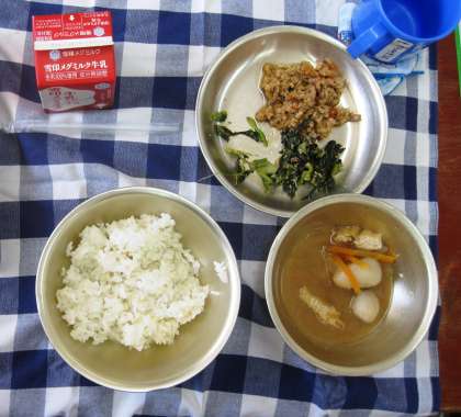 今日の給食の献立は麦ごはん,牛乳,とりそぼろ丼の具,小松菜のごまいため,いものこ汁でした。おかわりをして,たくさん食べている子どももいました。