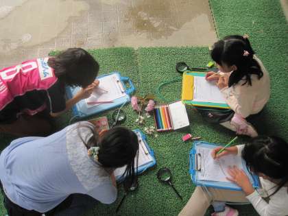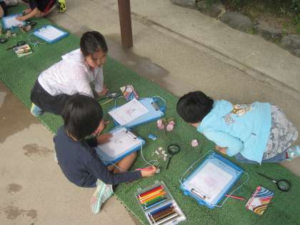 桜の花の観察をしました。子どもたちは虫眼鏡を使って,細かいところに注意して観察し,学習プリントに丁寧に書いていました。