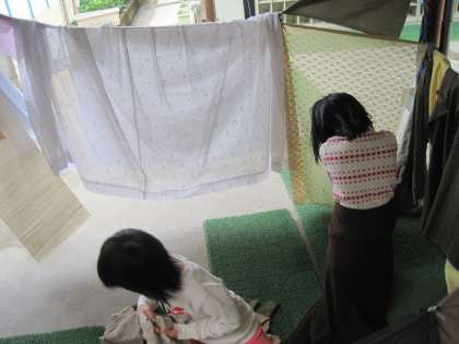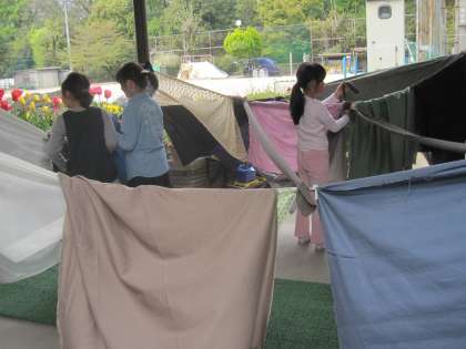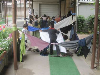 「ぬのでかざろう」の授業を渡り廊下で行いました。子どもたちは協力して相談しながら布を結んで作品作りをしました。
