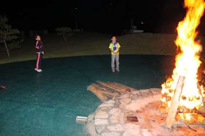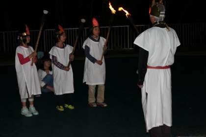 2日目の夜はキャンプファイアーをしました。火の神様から火の子どもが火を授かりました。グループ毎に出し物やゲームをしてみんなで楽しい時間を過ごしました。