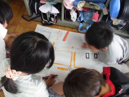 社会で校区探検に行き,調べたことを地図にまとめています。