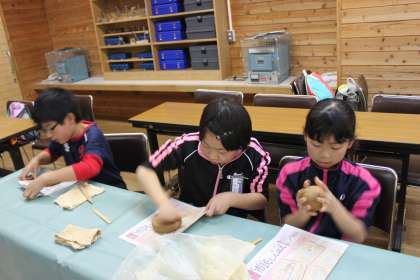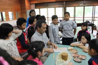 まず、指導者(子どもたちは師匠と呼んでいました。)に粘度の扱い方や竹べらの使い方を教えてもらいました。それから、いよいよ製作です。教えてもらったように、粘度に空気が入らないように気をつけながら、チャレンジしました。
