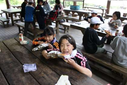 3日目の朝は山の家に来ている5つの学校合同で朝の集いをしました。朝食は野外炊事場でパックドックを作って食べました。