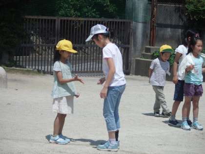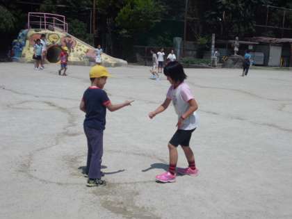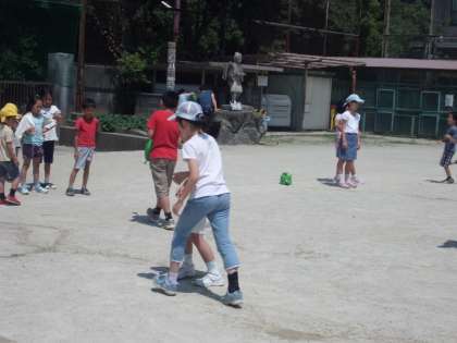 今週の業間体育は、縦割り活動です。時間になるとリーダーが、運動場に線を描いて、みんなで「どんじゃんけん」をしています。