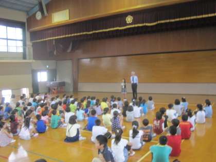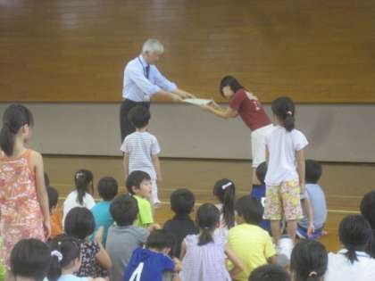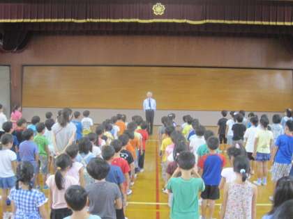 本日より授業・給食が再開されました。朝会ではまず,学校長が夏休みの豪雨についての話をしました。続いて司会の担当教員が運動会に向けての話をしました。その次に,転校してきたお友達の紹介を学校長が行いました。最後に写生会の入選者の表彰を行いました。