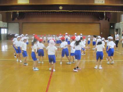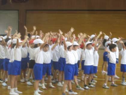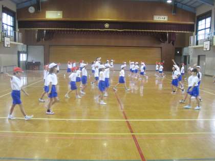 運動会の団体演技の練習は順調に進んでいます。今日も体育館で練習をしました。曲の最後まで通して練習ができました。最後のポーズ,とても素敵でした。