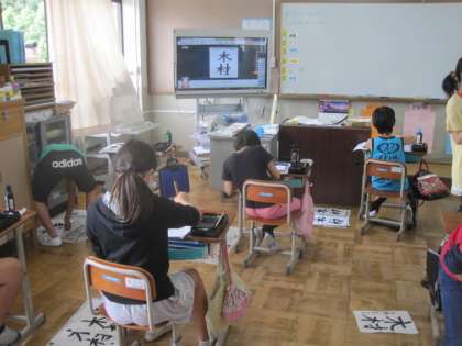 「木材」を書きました。子どもたちは文字のバランスや「へん」と「つくり」の大きさに気をつけながら,一画ずつ丁寧に書いていました。
