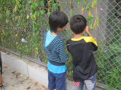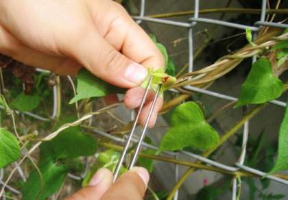 花粉のはたらきについて学習をしています。「実ができるためには受粉が必要なのだろうか」をめあてとして実験を行っています。今日はアサガオのつぼみにカッターナイフで切れ目を入れておしべを全部とりました。そのつぼみに袋をかけました。