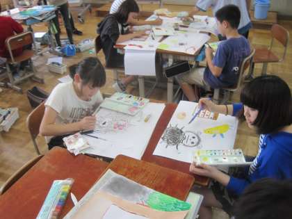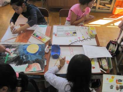 お話の絵を描いています。全体の色合いに気をつけて色を塗ったり細かなところに気をつけて色を塗ったりしました。