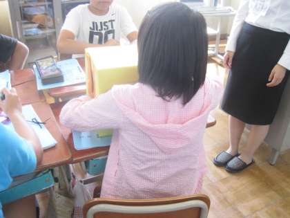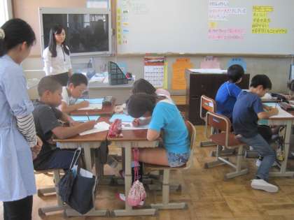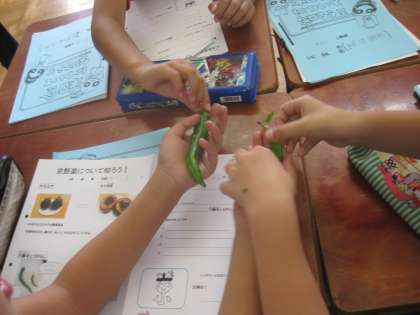 同志社女子大の協力により,食についての指導で「京野菜」について子どたちは学習しました。初めに箱の中に入っている京野菜を触ってどの京野菜かを答えました。次に,京野菜の特徴について学習しました。最後のまとめでは,京野菜についての質問をプリントに書いている子どもがいました。