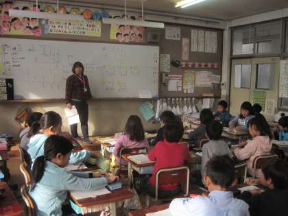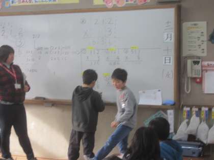 かけ算のひっ算の学習をしました。練習問題を解いて,数名の子どもがホワイトボードに答えを書きに出ました。その後,みんなで答え合わせをしました。