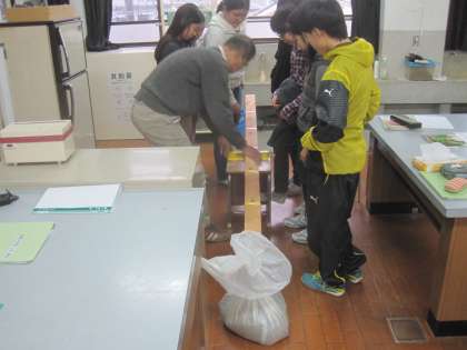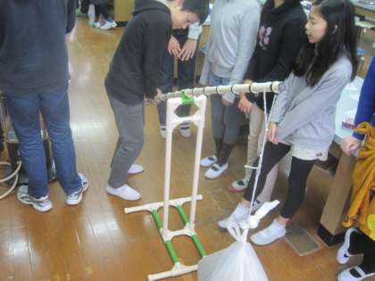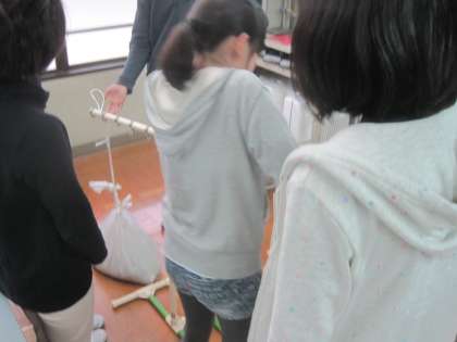 今日は力点の位置を変えると同じ重さのものでも手ごたえが変わることを実験で確かめました。