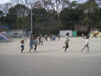 子どもたちは毎日中間休みの前に5分間マラソンを走っています。どの学年の子どももしっかり走っています。