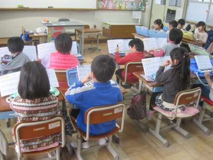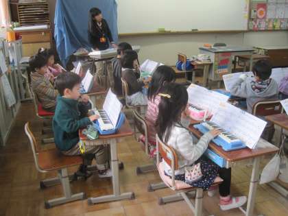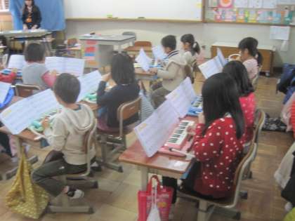 初めは「むずかしいい」と言っていた子どもがいましたが,練習を繰り返すと上手に演奏できていました。みんなでとても美しい音色を奏でていました。
