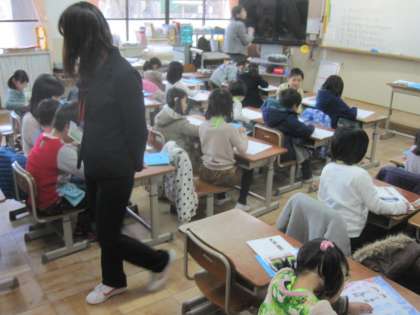 1年生の教室で新1年生の子ども達は読み聞かせを聞いたり,折り紙をしたり,お絵かきをしたりしました。