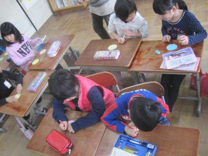 縦割りグループでお世話になった6年生のお兄さん,お姉さんに卒業おめでとうとお世話になった感謝の気持ちを込めてメッセージを書きました。