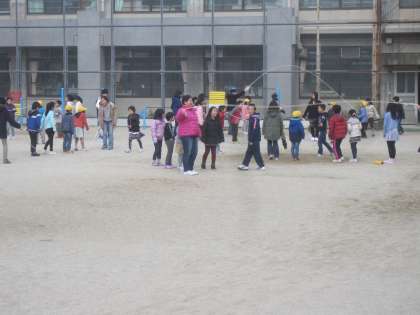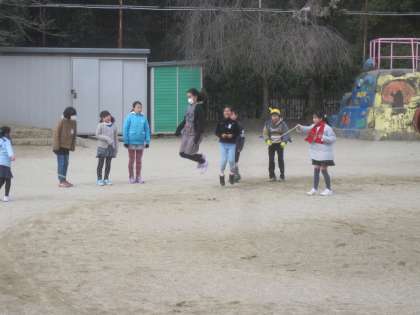 小雪のちらつく天候でしたが,子ども達は縦割りグループで仲良く大縄跳びをしました。