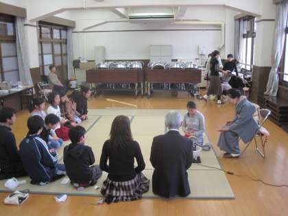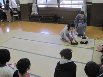 茶道部に入っている6年生の子ども達が校長先生,担任の先生とクラスの友達にお点前を披露しました。