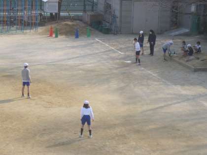 バッターボックスに入ると苦手な子どももラケットにボールを当てようと一生懸命です。友達はアドバイスと声援を送っています。