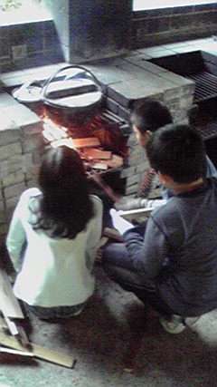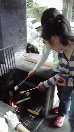 野外炊事では、班でカレーを作っています。写真は、「かまどの様子」と「焼きマシュマロ」に挑戦している様子です。