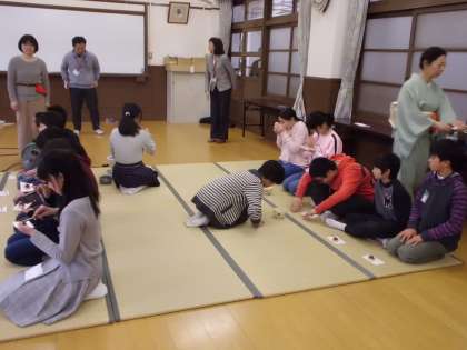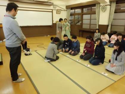「一期一会」の掛け軸,お茶花が生けられ,茶道の先生方に おうすのいただき方を教わりながらお茶をいただきました。