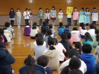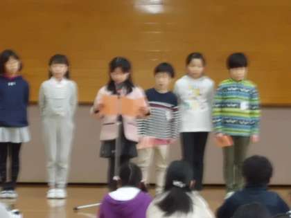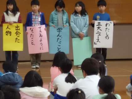 6人が代表して発表しました。「販売体験のこと」「読んだ本のこと」「赤ちゃんの誕生」「水泳教室のこと」「百人一首のこと」・・・・・・今年の三大ニュースをわかりやすく発表することができました。