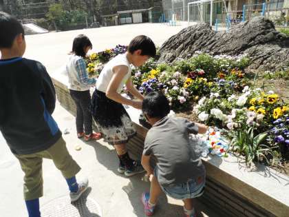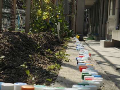 運動場のいつもの場所を,カップやペットボトルのふたや空き箱を使って,変身させました。