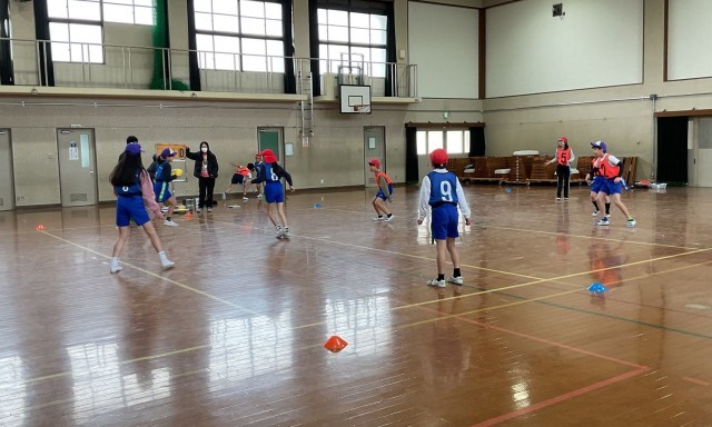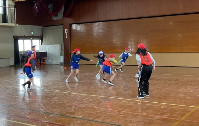 体育科では、先週から「陣取りゲーム」を行っています。いつもドッジボールをしていて、ボールの扱いには慣れている児童が多い学級ですが、楕円形のボールには、苦戦している様子です。また、後ろに投げることにも慣れていないので、つい前に投げてしまう様子もあります。声をかけ合い、パスをすることを目標にして、ゲームを楽しんでいます。