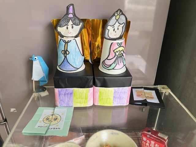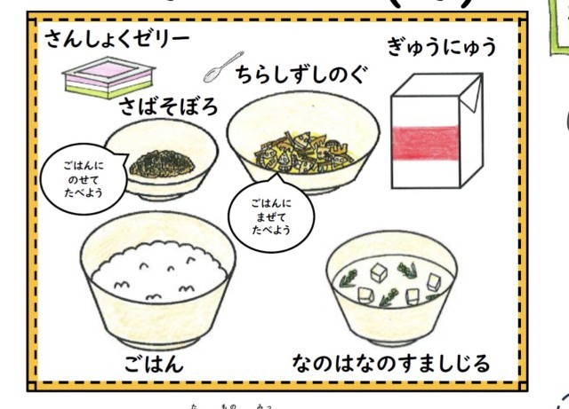一日早いですが、今日はひなまつりの行事献立です。3月3日のひな祭りは、子どもたちの健康や成長を願って行われる日本の大切な行事です。今日の給食では、ひな祭りにちなんでちらし寿司を食べます。京都府の丹後地方では、ちらし寿司の上にさばそぼろを乗せるちょっと特別な食べ方があります。地域ならではの味を楽しんで食べました。