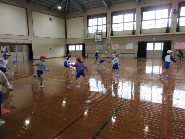 1枚目は、ALTのリリアン先生と一緒に英語活動をしました。生き物が出て来る英語の絵本を読んでもらいました。2枚目は、3色おにごっこの様子です。追いかける事と見方を助ける事の両方を考えながら遊びました。