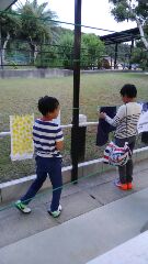さっぱりと,1日の疲れを流します。「気持ちいいねー。」「おっと!濡らしたタオルを干しておこう。」自分のことは,自分でします。