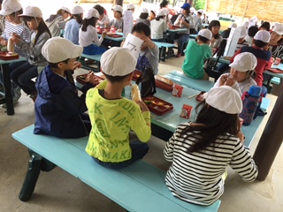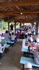朝の集いの後は,あずまや(屋外)で,お待ちかねの朝食です。すがすがしい空気の中で,しっかり食べて2日目の活動に備えたいと思います。