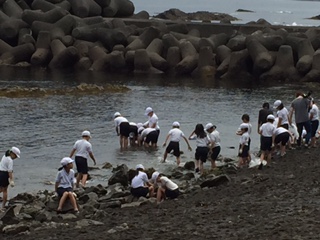 サザエやタコ,ヒトデ,イソギンチャク,ウニ,魚などたくさんの生き物と触れ合うことができて大喜びの子どもたちでした。みんな,夢中になって生き物を探していたので,ずぶ濡れです。でも,全然,寒くはありません。