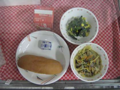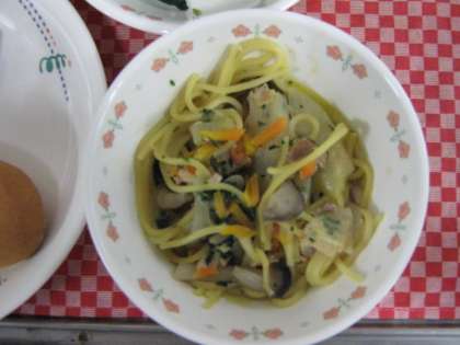スパゲティは小麦粉製品なので,同じ小麦粉からできているパンはいつもより小さい「小型コッペパン」との組み合わせになります。
