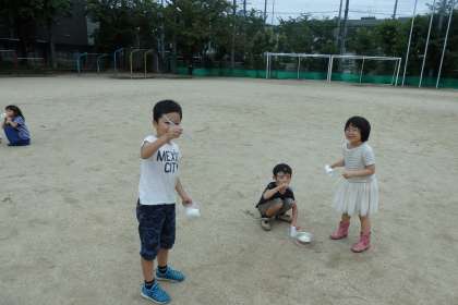 ストローや紙コップ,モールを使って,大きなシャボン玉を作ったり,一度にたくさんのシャボン玉をとばしたりして楽しみました。