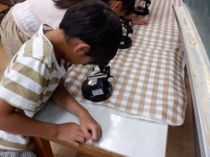 顕微鏡を使って観察をすると,殻のざらざらした様子がよくわかりました。