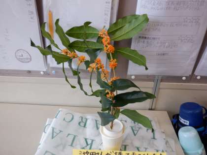 【4年】金木犀のかおり 公開日 2019/10/18 更新日 2019/10/18 4年生のページ 今日,クラスの子が金木犀を持ってきてくれました。 教室にいけて飾りました。みんないい香りにつられて, 休み時間に花の近くに集まってきていました。 気温も下がって,秋を感じる季節になってきました。 何か「秋」を感じるものがあったら,教えてほしいなと思います。