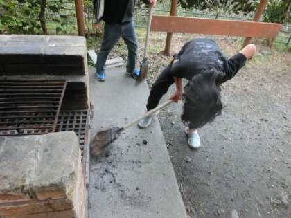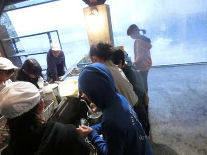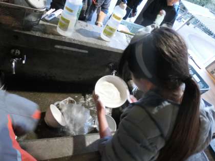 食器や鍋を洗ったりかまどの掃除をしたり,それぞれが自分の担当する仕事をがんばっていました。