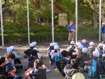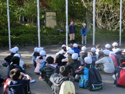 朝食を食べた後,玄関前に集合し,登山出発式を行いました。