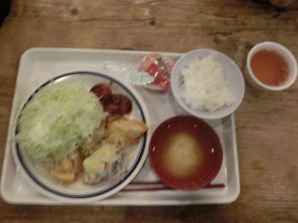 今日のおかずは,揚げ餃子,エビフライ,コーン焼売,ミニハンバーグ,じゃがいもの鶏そぼろあんかけ,サラダなどがありました。