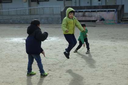 音楽科「にほんのうたをたのしもう」では,わらべうたに合わせたいろいろな遊びで楽しみました。「おおなみ こなみ」では,縄跳びを使って,歌に合わせて縄を跳び越えました。「おちゃらか ほい」では,歌に合わせたジャンケンゲームを楽しみました。