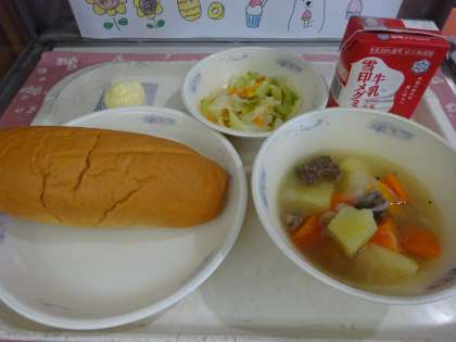 今日の献立は,味付けコッペパン・牛乳・アイルランド風ビーフシチュー・野菜のソテー・チーズでした。新献立でした。