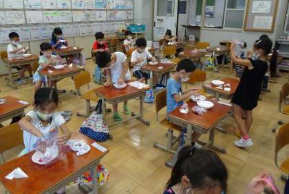 色水の濃さや浸し方によって1人1人違った模様が生まれるので,子どもたちは色水遊びをとても楽しんでいました。
