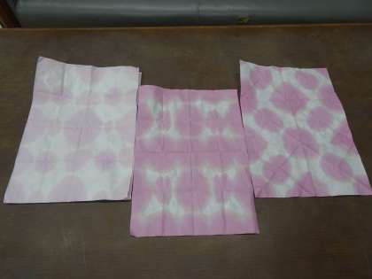 和紙を四角形や三角形に折りたたみ,その角に花から絞った色水を浸して染めました。