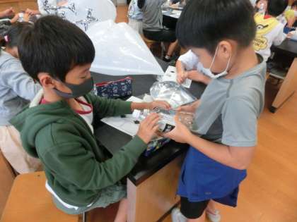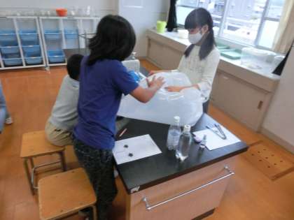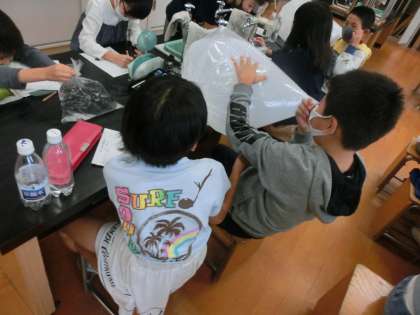 今日は,大きなゴミ袋や風船,ペットボトルなど色々なものに空気や水を閉じ込めて,どんな違いがあるのかを調べました。